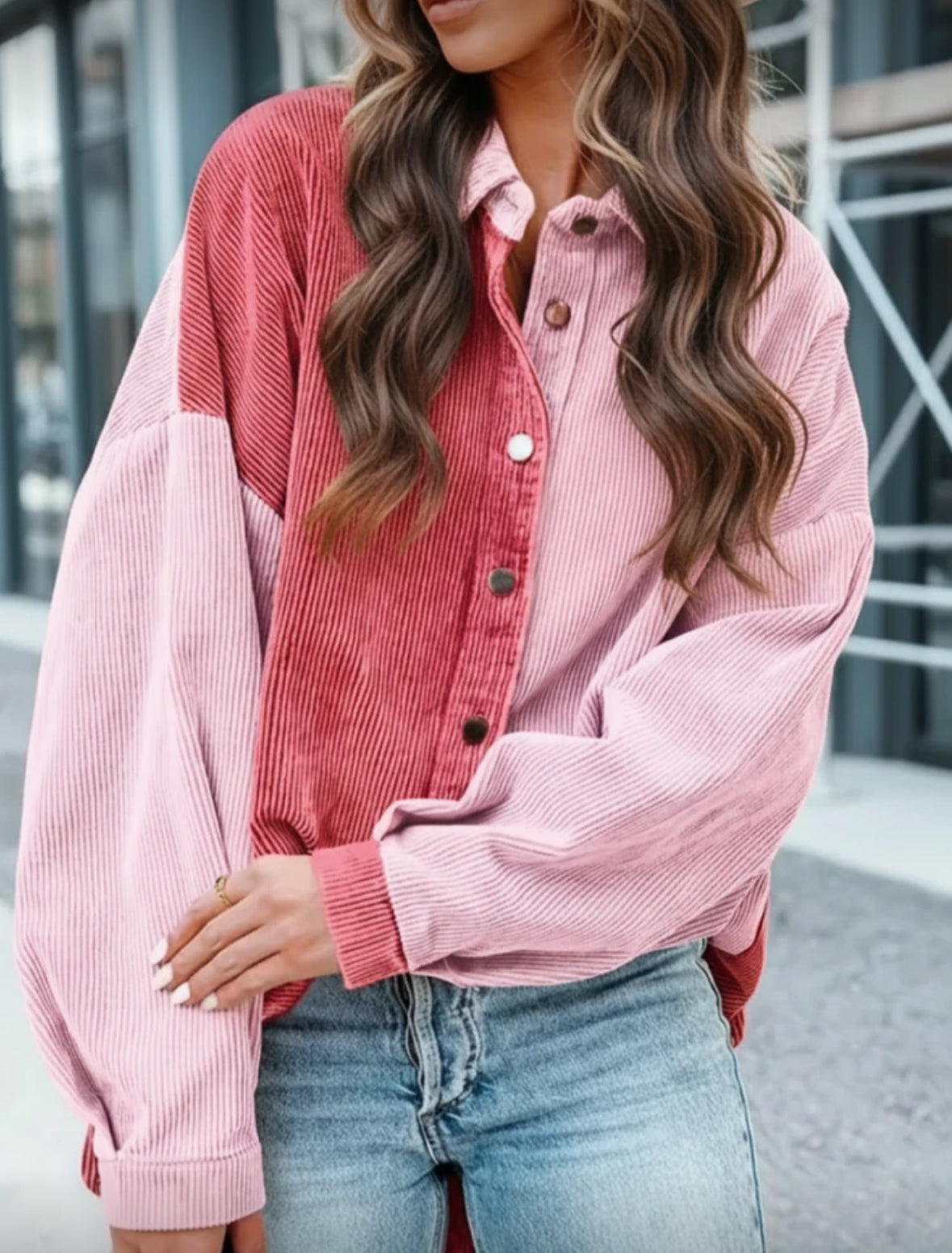 Chemise décontractée ample à épaules tombantes en velours côtelé bicolore pour femmes.