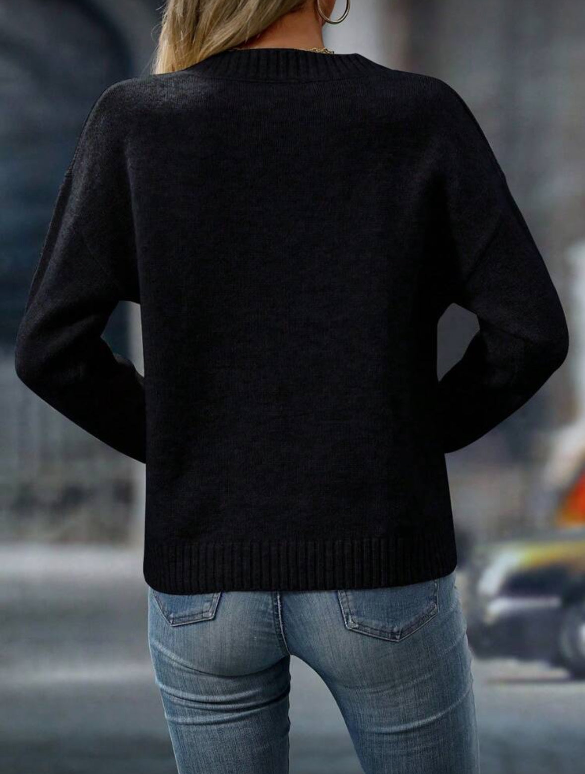 Pull ample à col V à manches longues et épaules dégagées, unicolore.