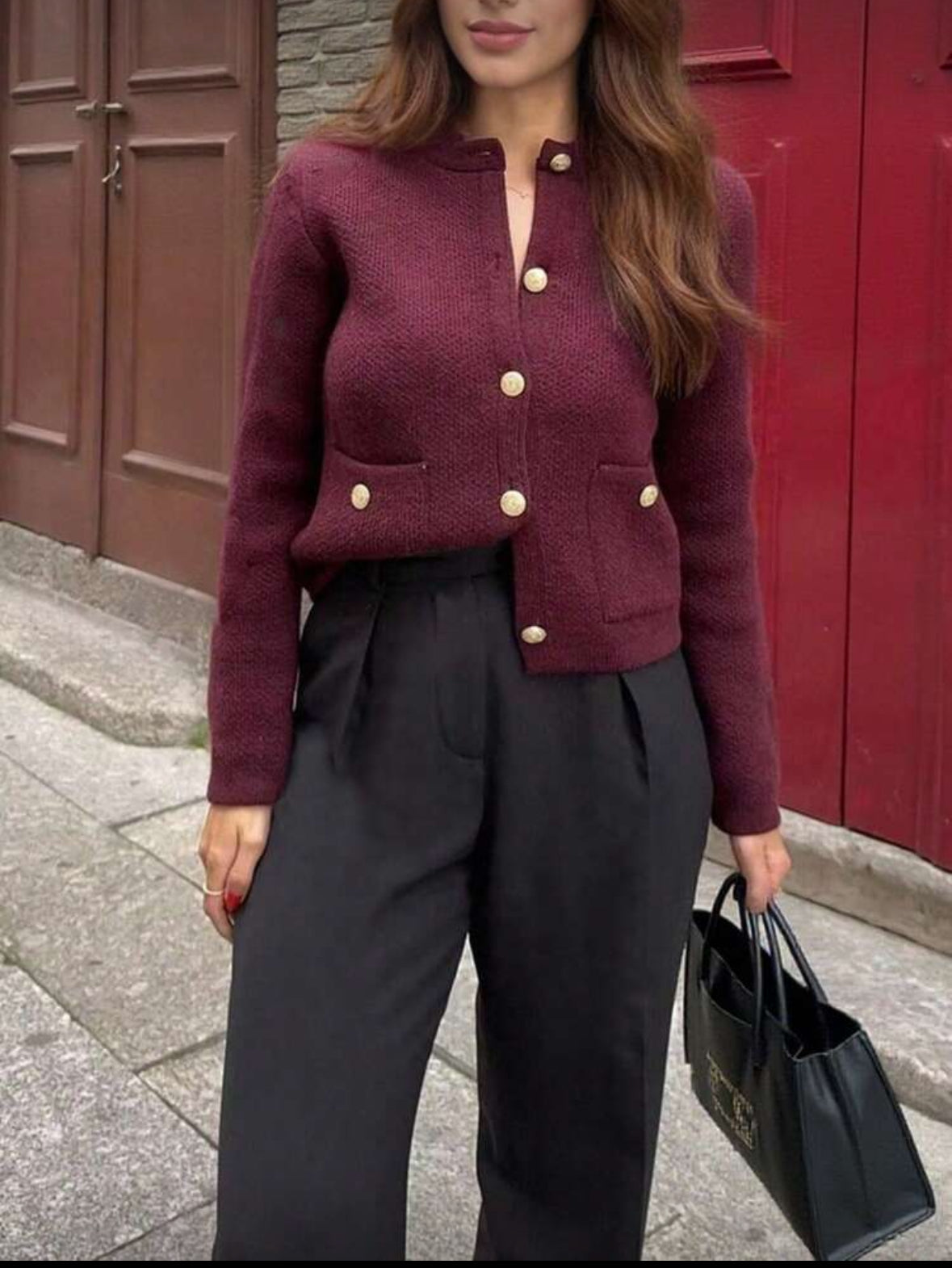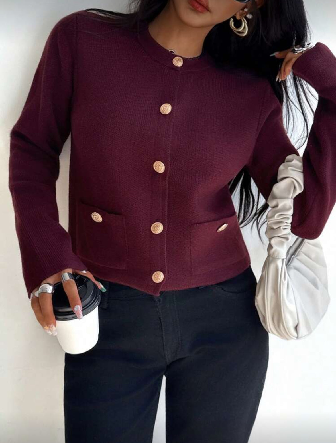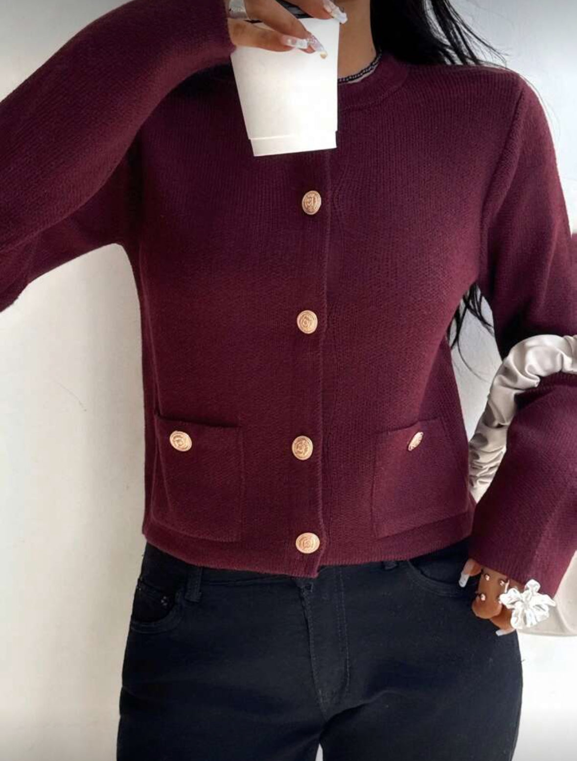 Pull tricoté avec accent de bouton doré pour l'automne/hiver, cardigan décontracté bordeaux.