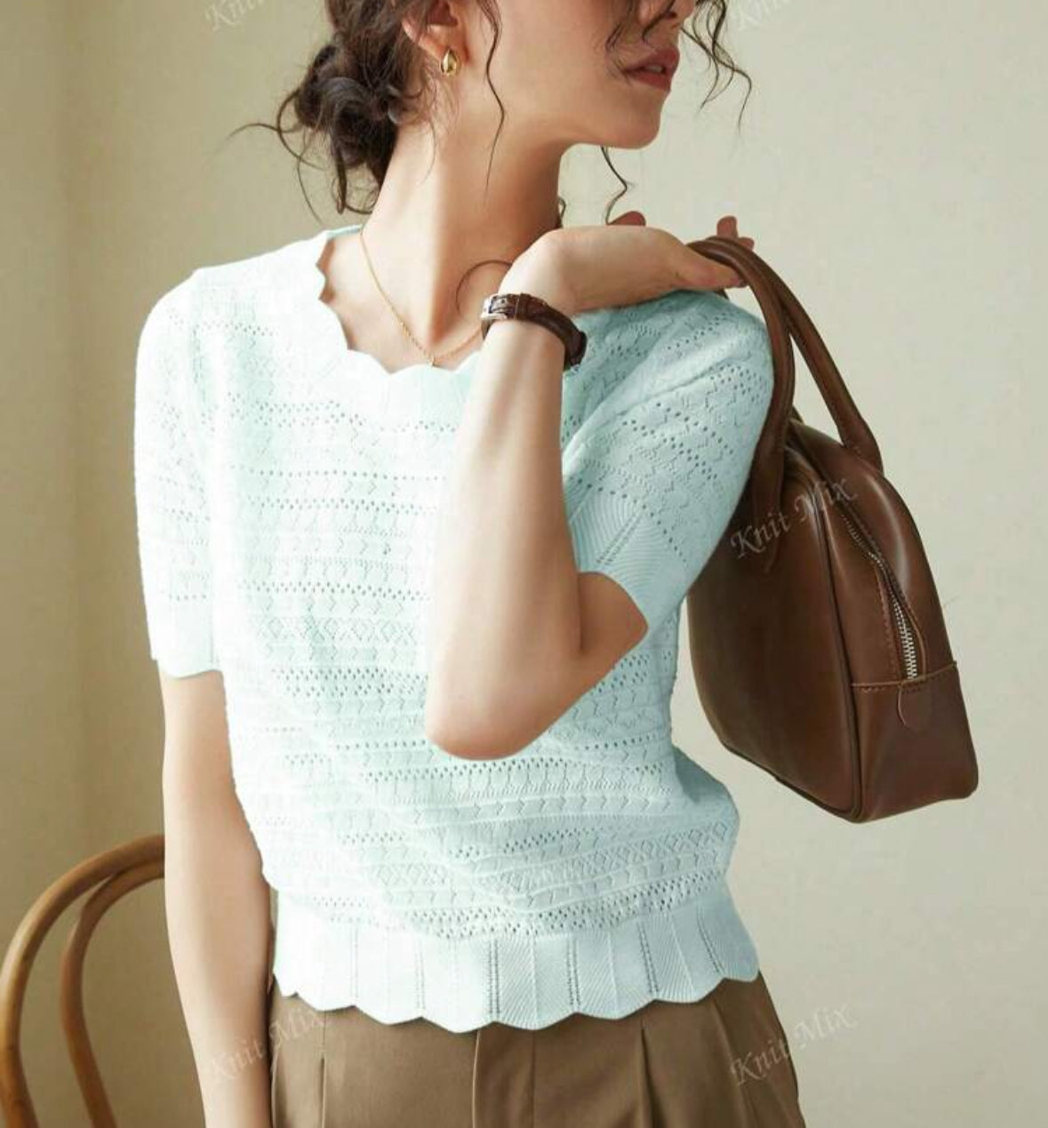 T-shirt à manches courtes régulier avec encolure ronde, empiècement en dentelle et effet ajouré, Couleur unie, style casual/bureau.
