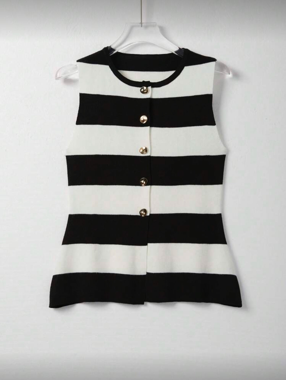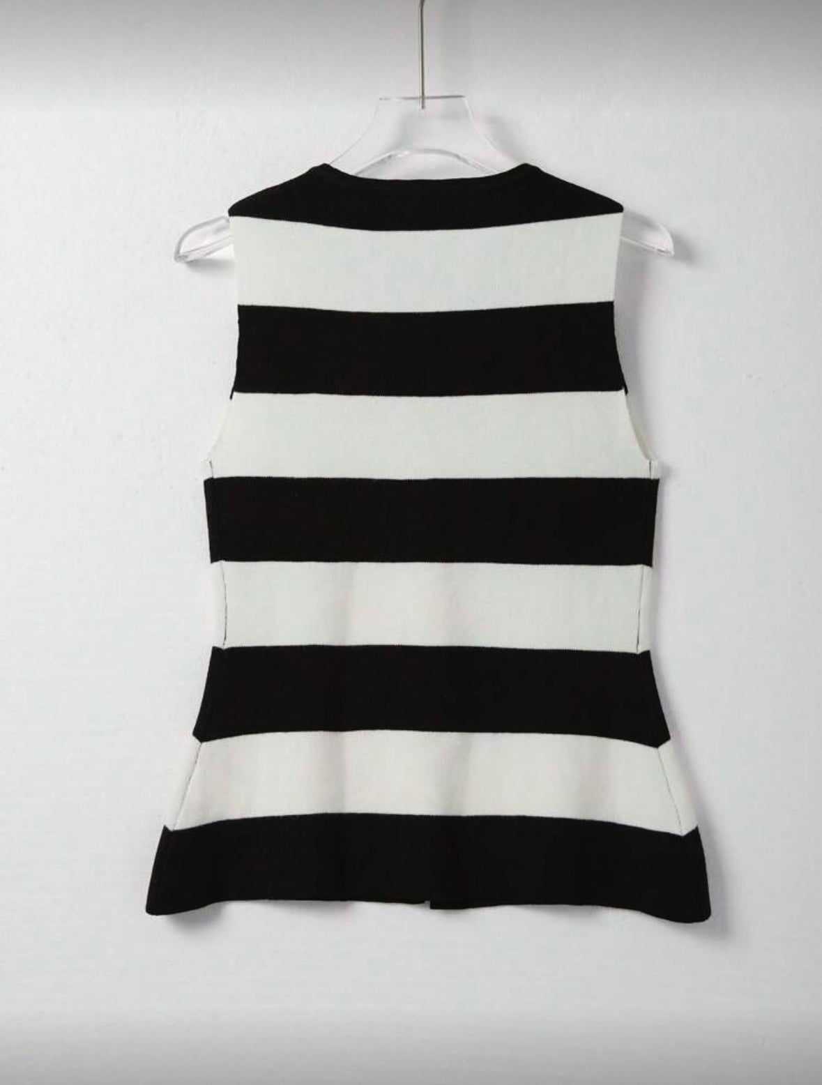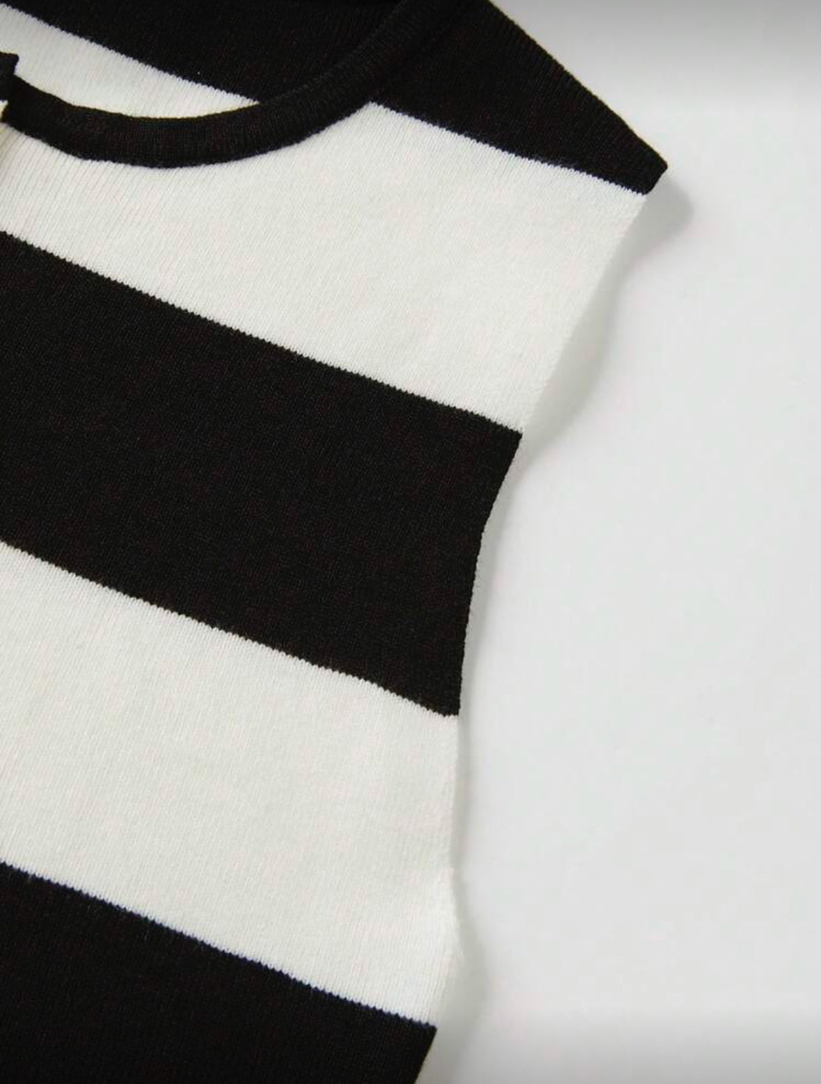 Cardigan femme urbain moderniste pour vacances. Top tricoté sans manches à rayures noires et blanches.