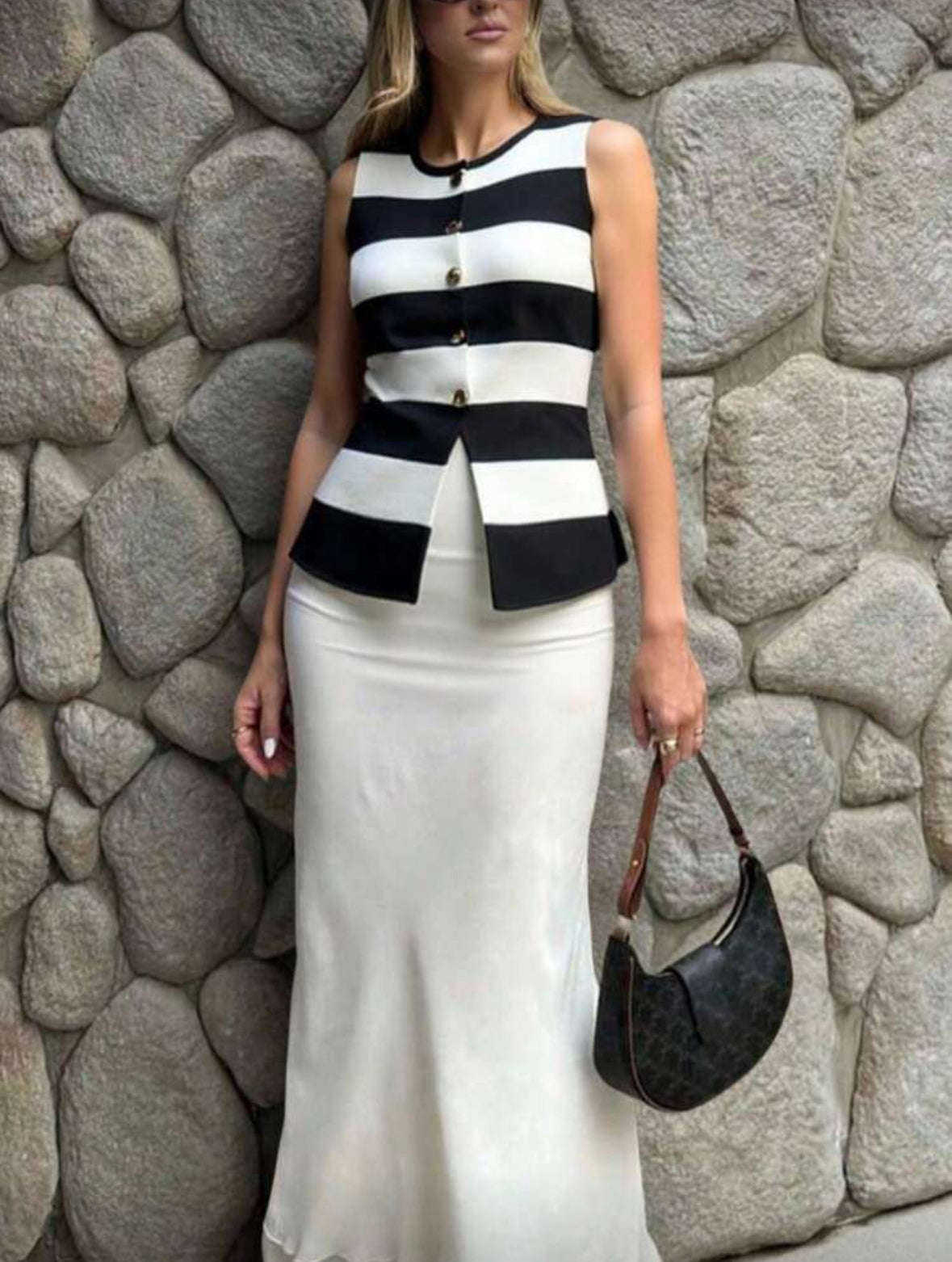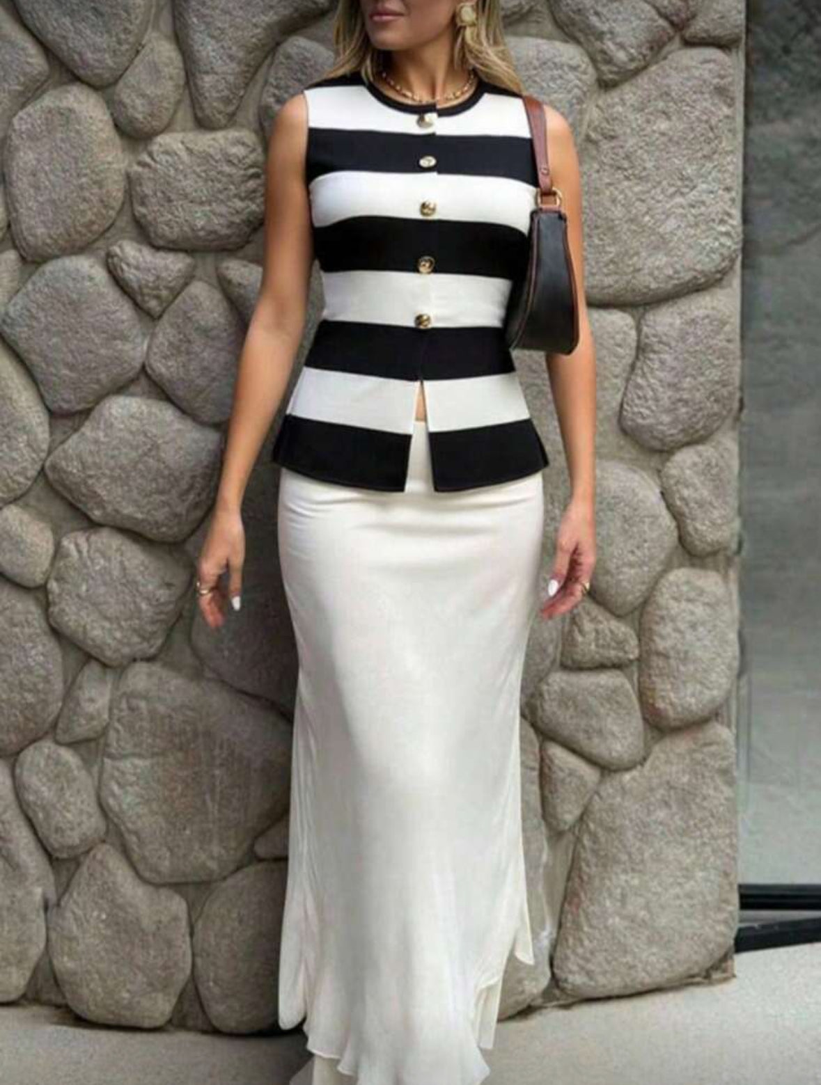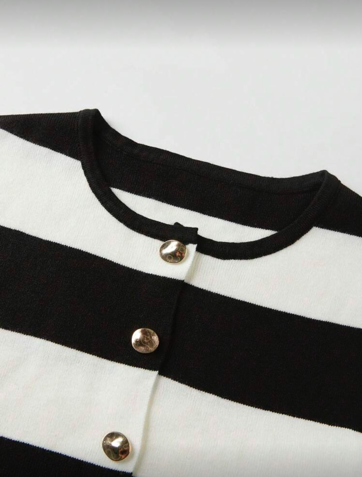 Cardigan femme urbain moderniste pour vacances. Top tricoté sans manches à rayures noires et blanches.