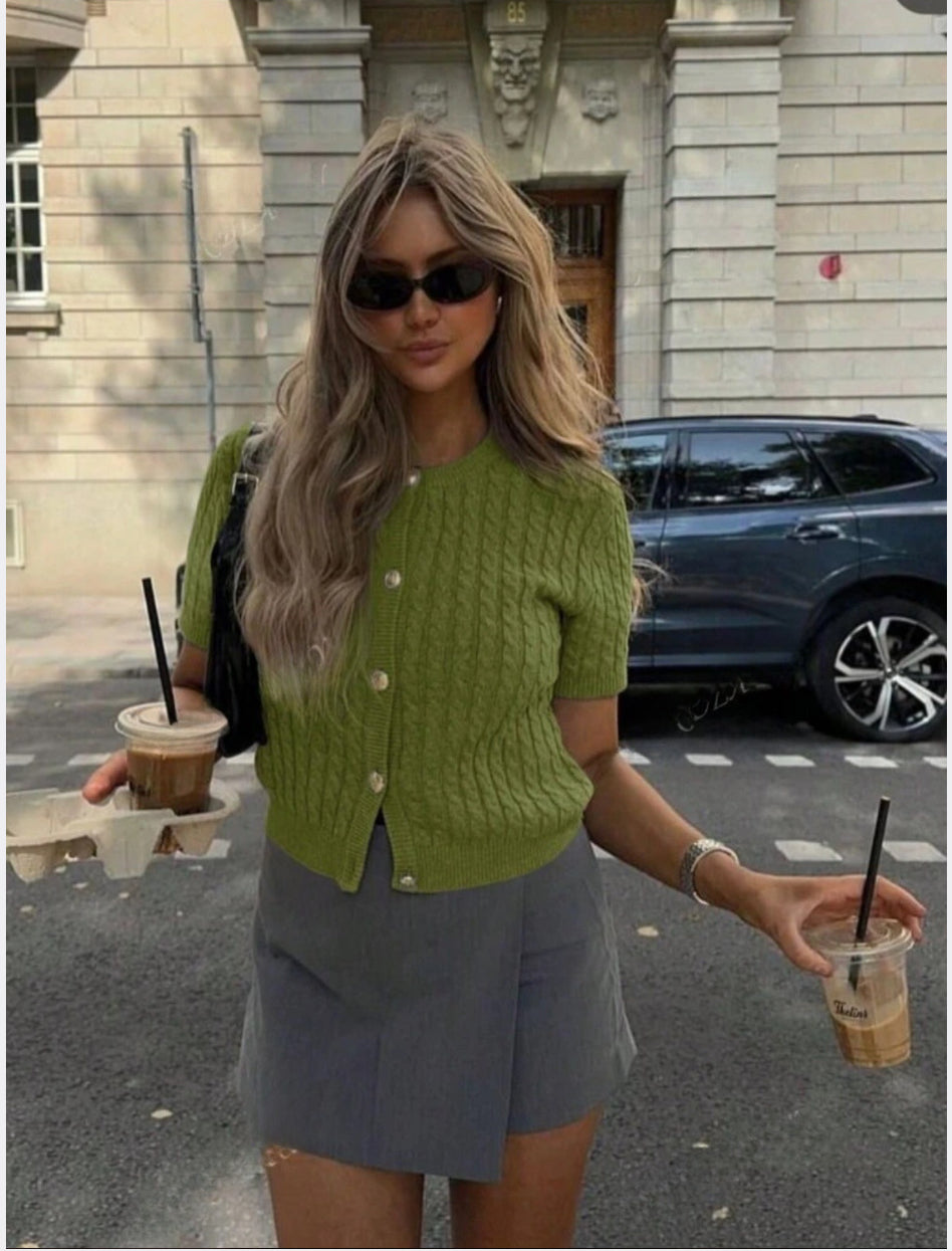Nouvelle Cardigan en tricot col rond boutonné à manches courtes pour femmes, pour le printemps/l'été, simple et minimaliste, de style tempéré, pull à manches courtes de style navette